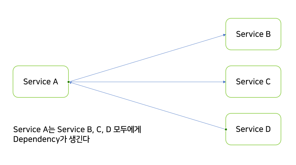 이 과정들을 RestAPI나 RPC 콜로 처리를 한다면 Service A는 모든 의존된 코드를 가지고 있어야 한다.