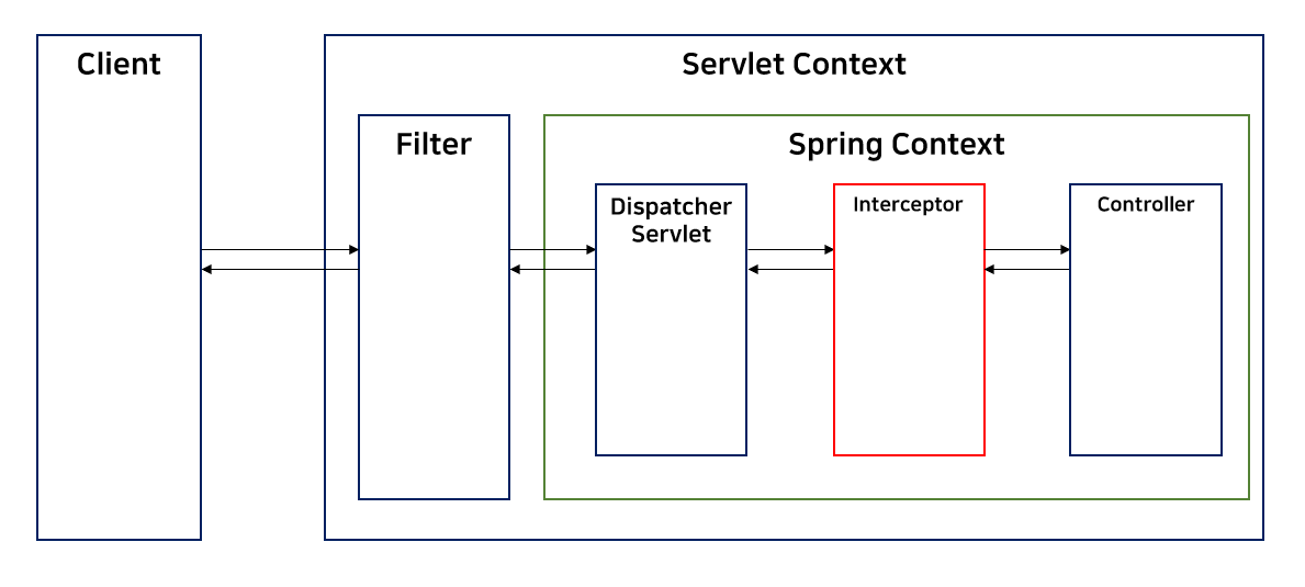 위에서 설명했듯이 필터와 인터셉터는 관리되는 영역이 다릅니다. 필터는 스프링 이전 영역에서 관리되지만, 인터셉터는 스프링 컨테이너 영역 안쪽에서 관리됩니다.