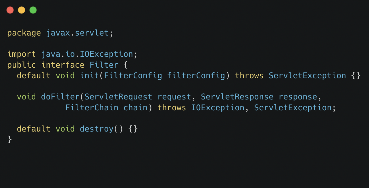 필터는 웹 애플리케이션에서 요청과 응답을 가로채서 처리하는 데 사용됩니다. 필터를 추가하기 위해서는 javax.servlet의 Filter 인터페이스를 구현해야하며, 이는 다음의 3가지 메소드를 가지고 있습니다.