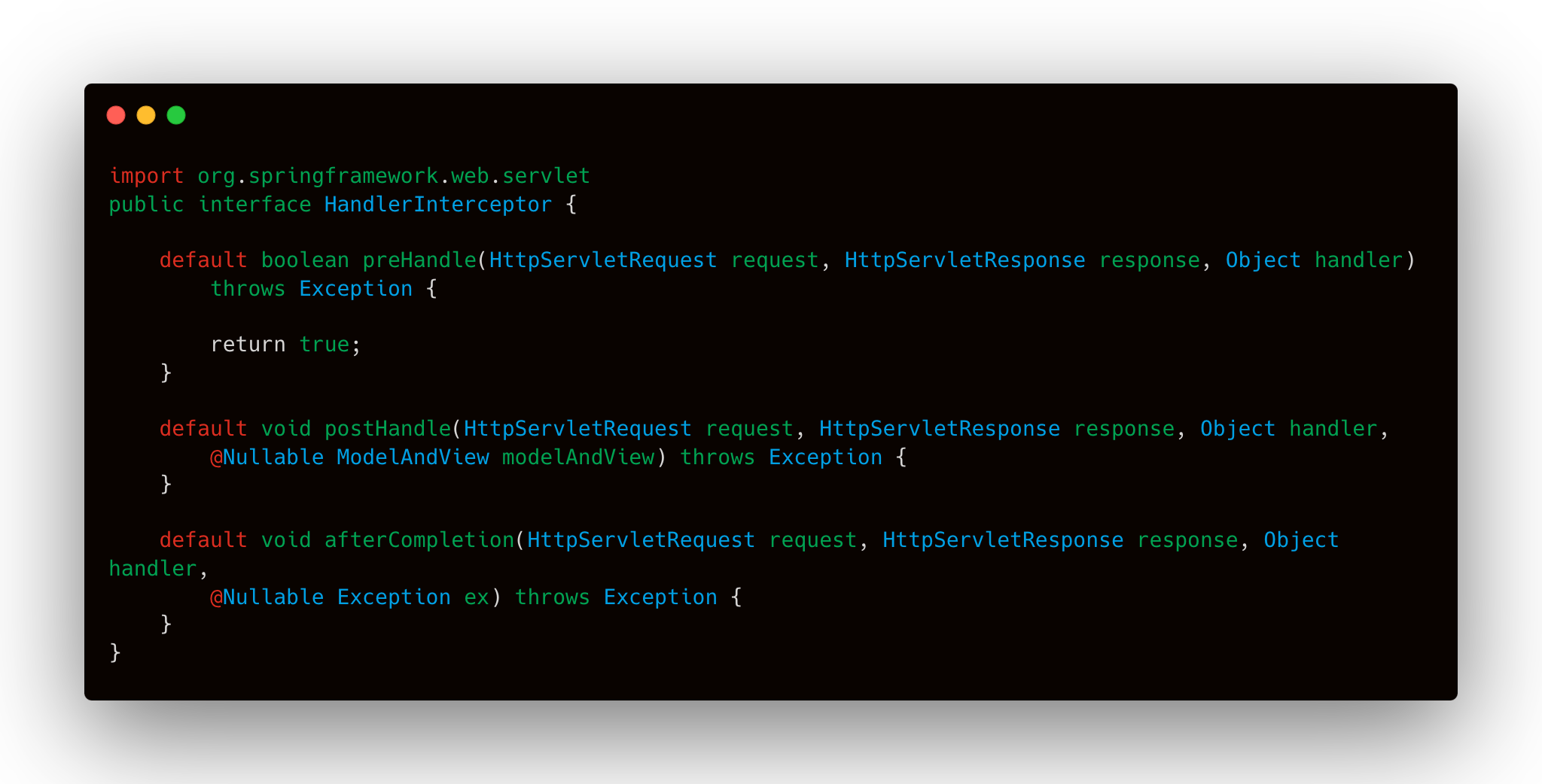 인터셉터를 추가하기 위해서는 HandlerInterceptor 인터페이스를 구현해야 하며, 이는 다음의 3가지 메소드를 가지고 있습니다.